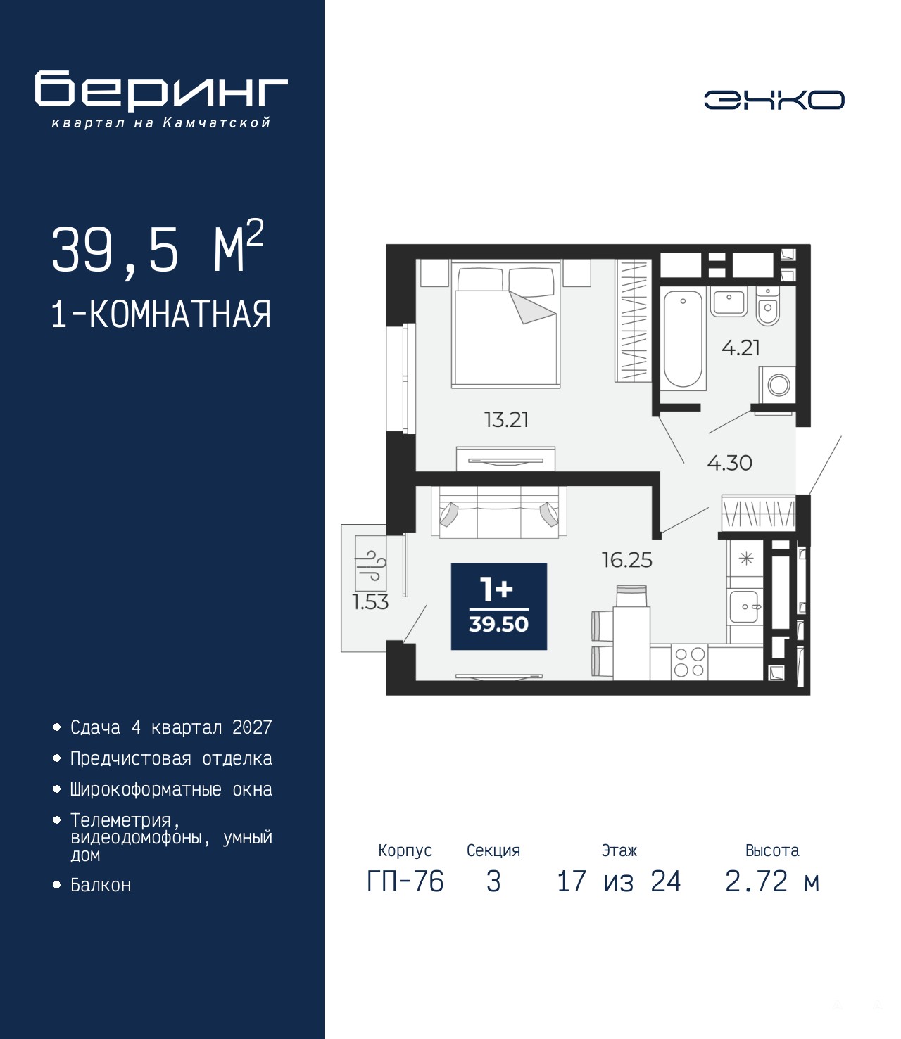 Просторная 1-комн. квартира с предчистовой отделкой в ЖК "Беринг" на 17 этаже. Общая площадь: 39.5 кв.м., жилая: 13.21 кв.м., площадь просторной кухни-столовой: 16.25 кв.м. Все окна выходят на одну сторону. В квартире один балкон, один совмещенный санузел. Высота потолков 2.72 м.