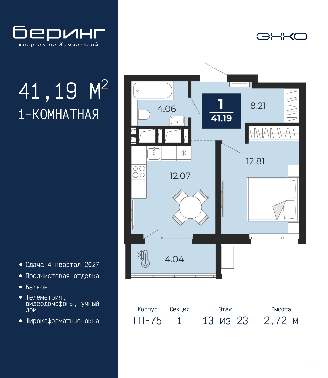 Продается однокомнатная квартира от застройщика с предчистовой отделкой в ЖК "Беринг" на 13 этаже. Общая площадь: 41.19 кв.м., жилая: 12.81 кв.м., площадь просторной кухни-столовой: 12.07 кв.м. Все окна выходят на одну сторону. В квартире один балкон, один совмещенный санузел. Высота потолков 2.72 м.