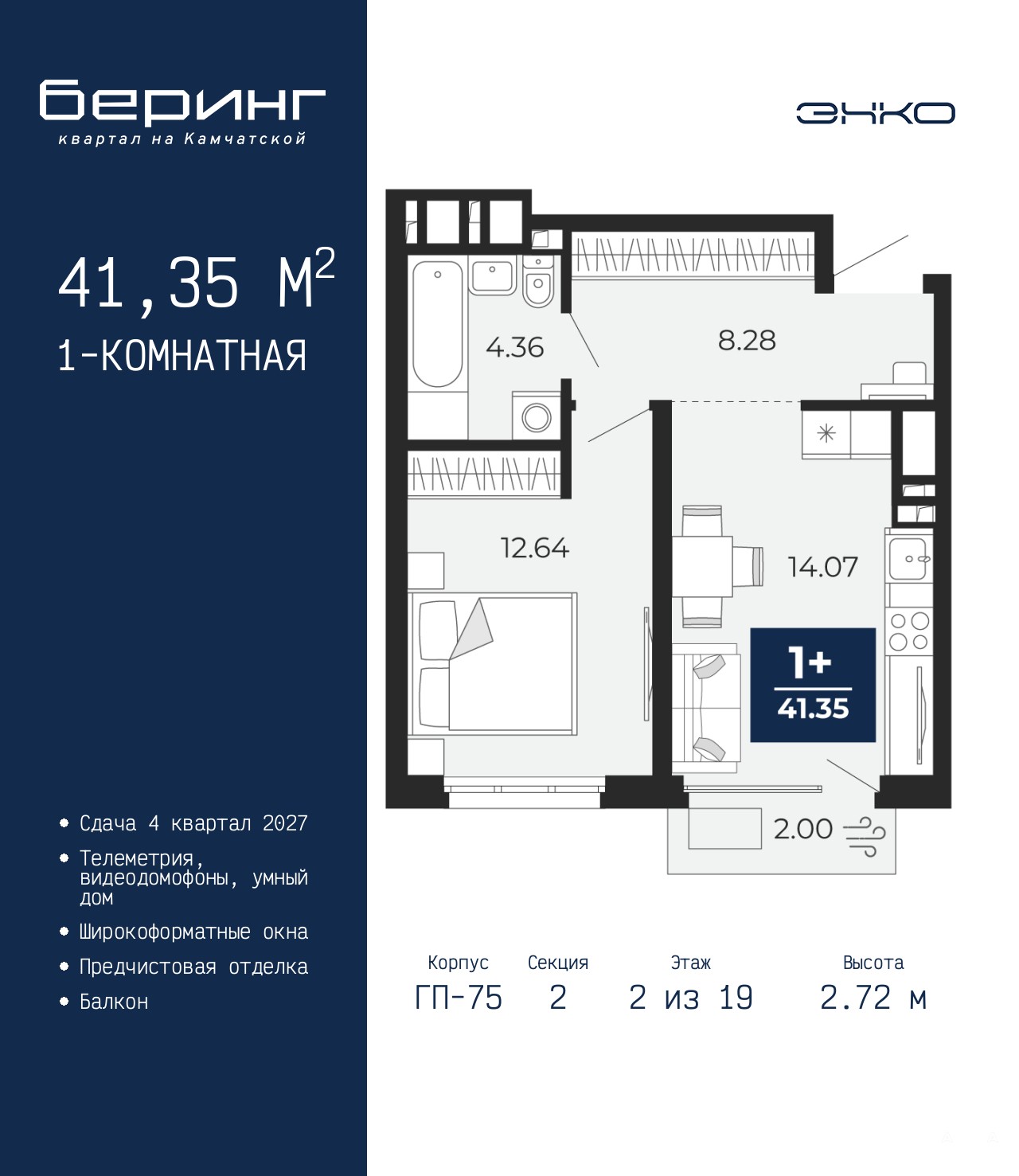 Продается 1-комн. квартира с предчистовой отделкой в ЖК "Беринг" на 2 этаже. Общая площадь: 41.35 кв.м., жилая: 12.64 кв.м., площадь просторной кухни-столовой: 14.07 кв.м. Все окна выходят на одну сторону. В квартире один балкон, один совмещенный санузел. Высота потолков 2.72 м.