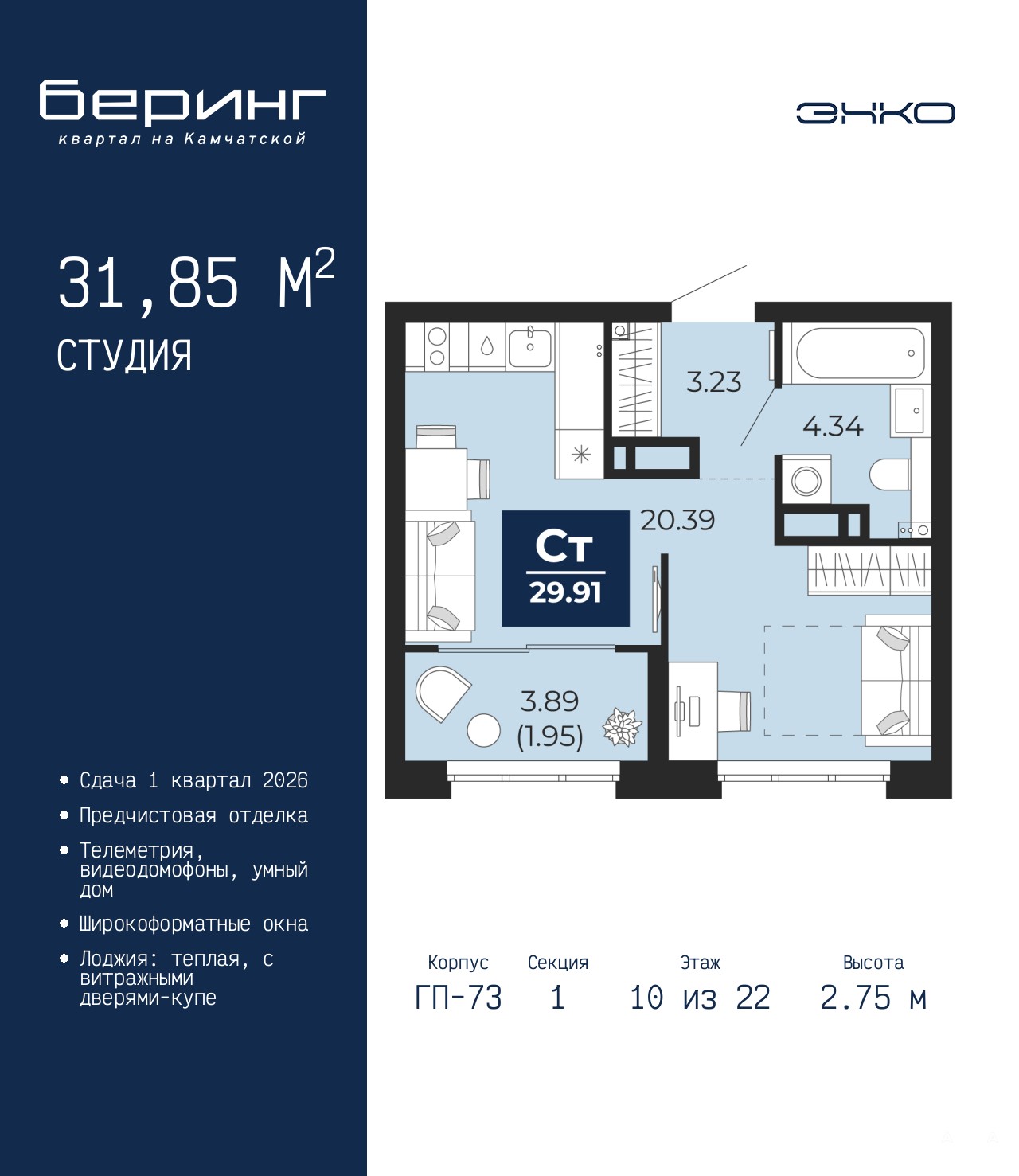 1-комн. квартира-студия от застройщика с предчистовой отделкой в ЖК "Беринг" на 10 этаже. Общая площадь: 31.85 кв.м., площадь гостиной 20.39 кв.м., из которых 5 кв.м. выделено под кухонную зону. Все окна выходят на одну сторону. В квартире одна лоджия, один совмещенный санузел. Высота потолков 2.75 м.