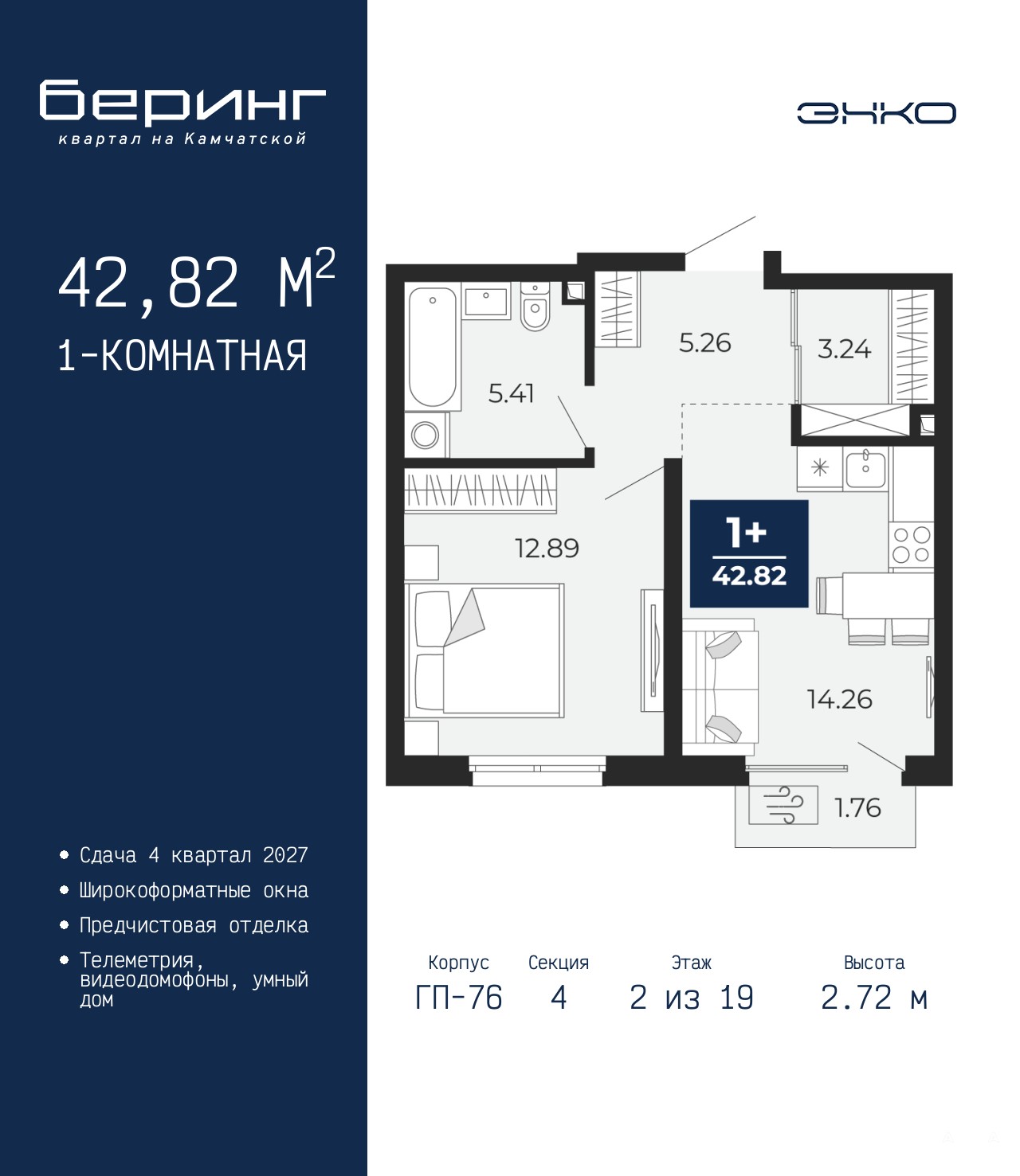 1-комн. квартира с предчистовой отделкой в ЖК "Беринг" на 2 этаже. Общая площадь: 42.82 кв.м. Высота потолков 2.72 м.