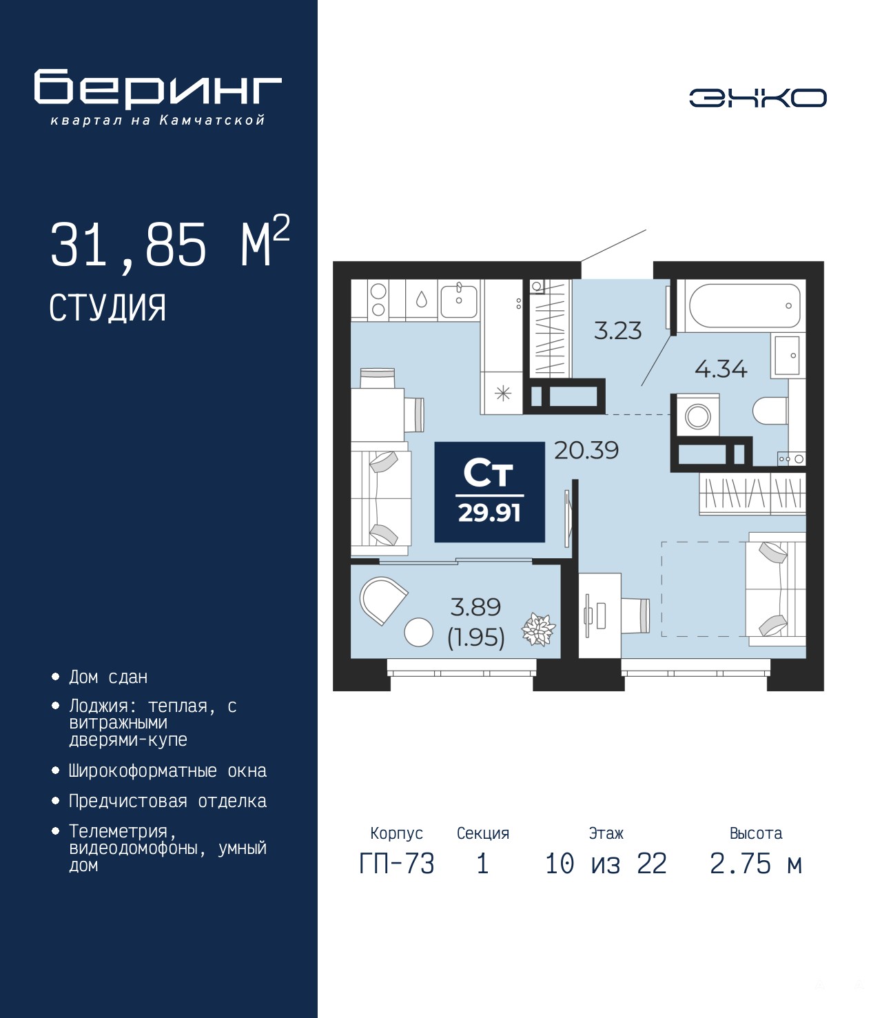Продается 1-комн. квартира-студия с предчистовой отделкой в ЖК "Беринг" на 10 этаже. Общая площадь: 31.85 кв.м., площадь гостиной 20.39 кв.м., из которых 5 кв.м. выделено под кухонную зону. Все окна выходят на одну сторону. В квартире одна лоджия, один совмещенный санузел. Высота потолков 2.75 м.