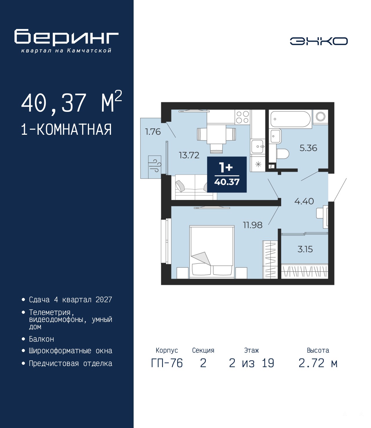 Просторная однокомнатная квартира с предчистовой отделкой в ЖК "Беринг" на 2 этаже. Общая площадь: 40.37 кв.м., жилая: 11.98 кв.м., площадь просторной кухни-столовой: 13.72 кв.м. Все окна выходят на одну сторону. В квартире один балкон, один совмещенный санузел. Высота потолков 2.72 м.