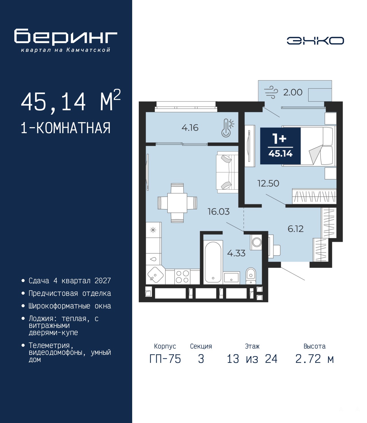 Продается однокомнатная квартира от застройщика с предчистовой отделкой в ЖК "Беринг" на 13 этаже. Общая площадь: 45.14 кв.м., жилая: 12.5 кв.м., площадь просторной кухни-столовой: 16.89 кв.м. Все окна выходят на одну сторону. В квартире один балкон и одна лоджия, один совмещенный санузел. Высота потолков 2.72 м.
