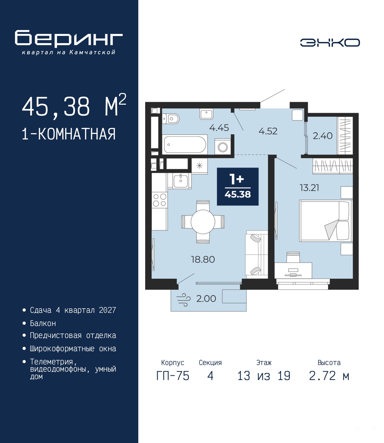 Продается однокомнатная квартира с предчистовой отделкой в ЖК "Беринг" на 13 этаже. Общая площадь: 45.38 кв.м., жилая: 13.21 кв.м., площадь просторной кухни-столовой: 18.8 кв.м. Все окна выходят на одну сторону. В квартире один балкон, один совмещенный санузел. Высота потолков 2.72 м.