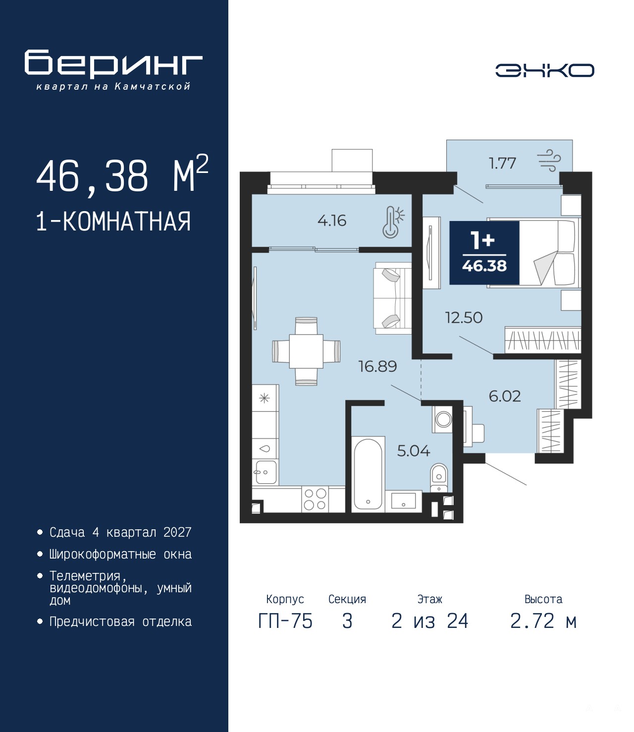 1-комн. квартира в ЖК "Беринг" на 2 этаже. Общая площадь: 46.38 кв.м. Высота потолков 2.72 м.