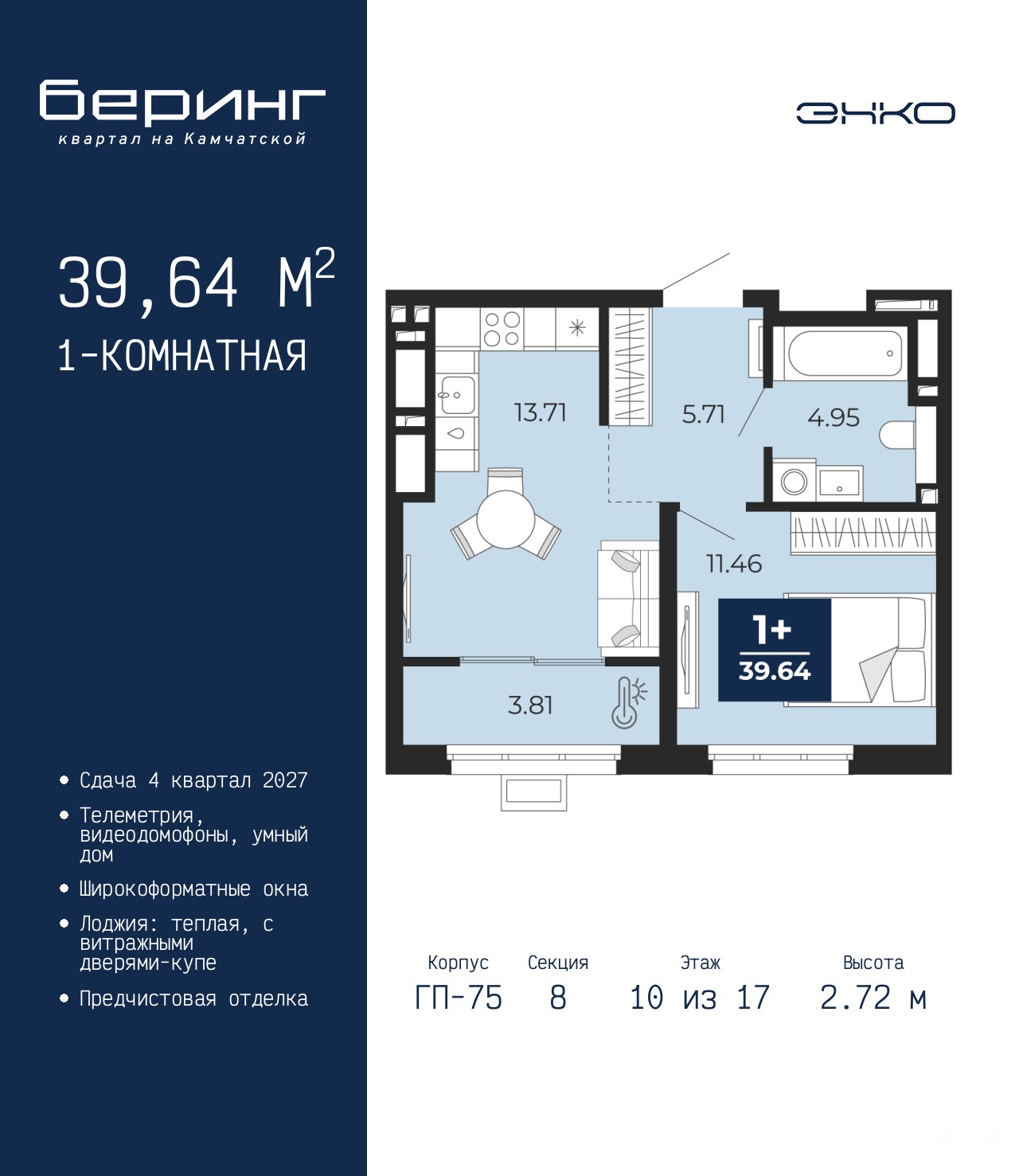 Просторная 1-комн. квартира с предчистовой отделкой в ЖК "Беринг" на 10 этаже. Общая площадь: 39.64 кв.м., жилая: 11.46 кв.м., площадь просторной кухни-столовой: 13.71 кв.м. Все окна выходят на одну сторону. В квартире одна лоджия, один совмещенный санузел. Высота потолков 2.72 м.