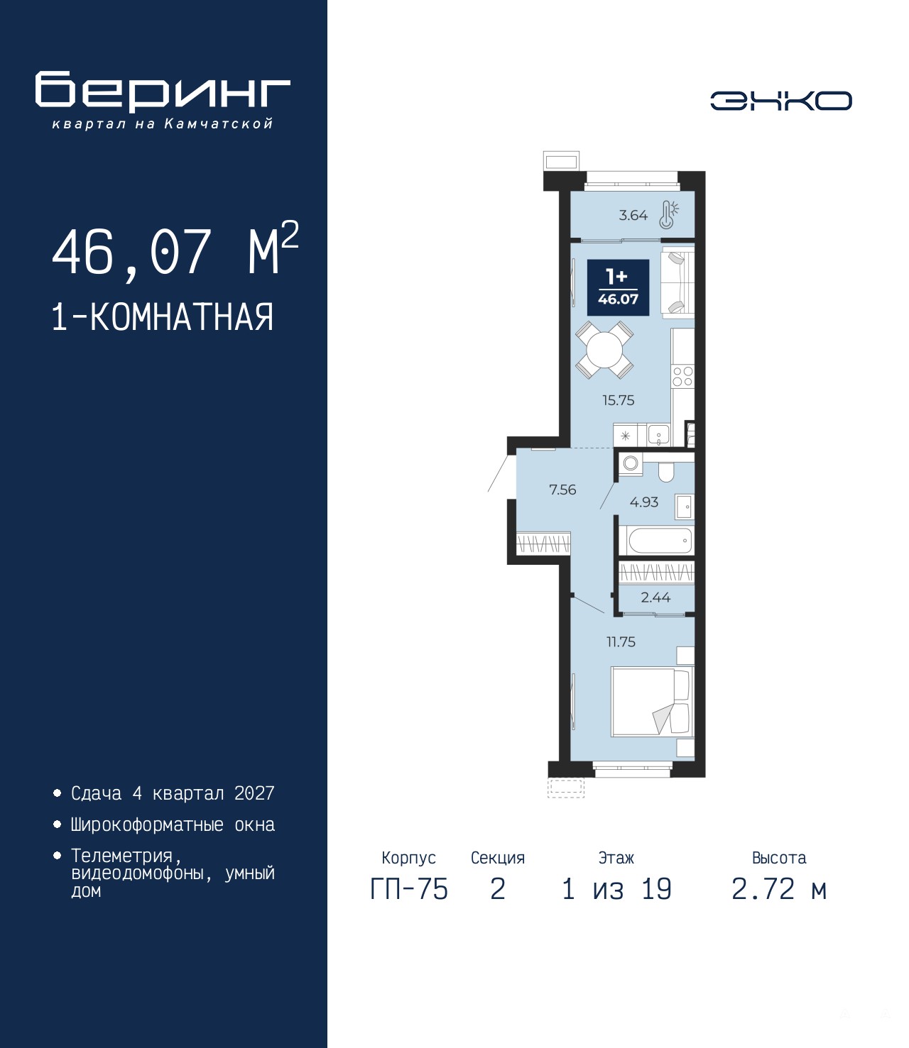 1-комн. квартира в ЖК "Беринг" на 1 этаже. Общая площадь: 46.07 кв.м. Высота потолков 2.72 м.