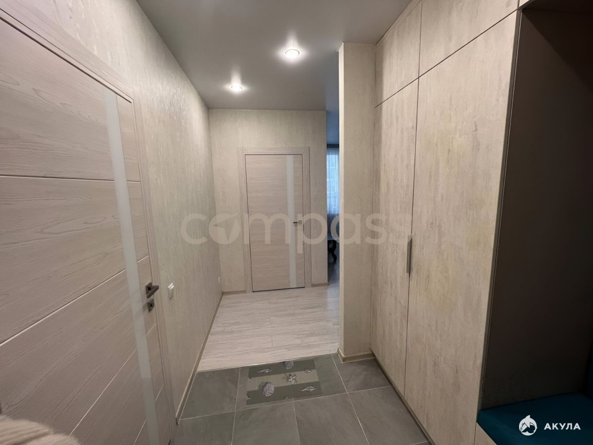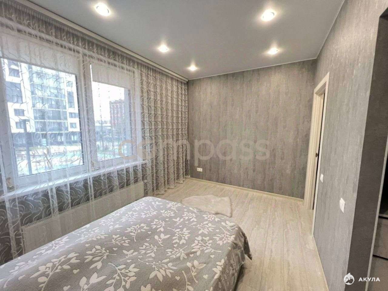 Просторная квартира формата 1+, интересное планировочное решение: кухня гостиная с выходом на балкон с панорамным остеклением и спальня с гардеробной, окна выходят во двор дома.