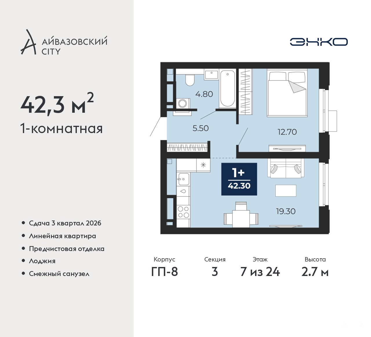 Продается 1-комн. квартира от застройщика с предчистовой отделкой в ЖК "Айвазовский City" на 7 этаже. Общая площадь: 42.3 кв.м., жилая: 13.4 кв.м., площадь просторной кухни-столовой: 17.1 кв.м. Все окна выходят на одну сторону. В квартире одна лоджия, один совмещенный санузел. Высота потолков 2.7 м.