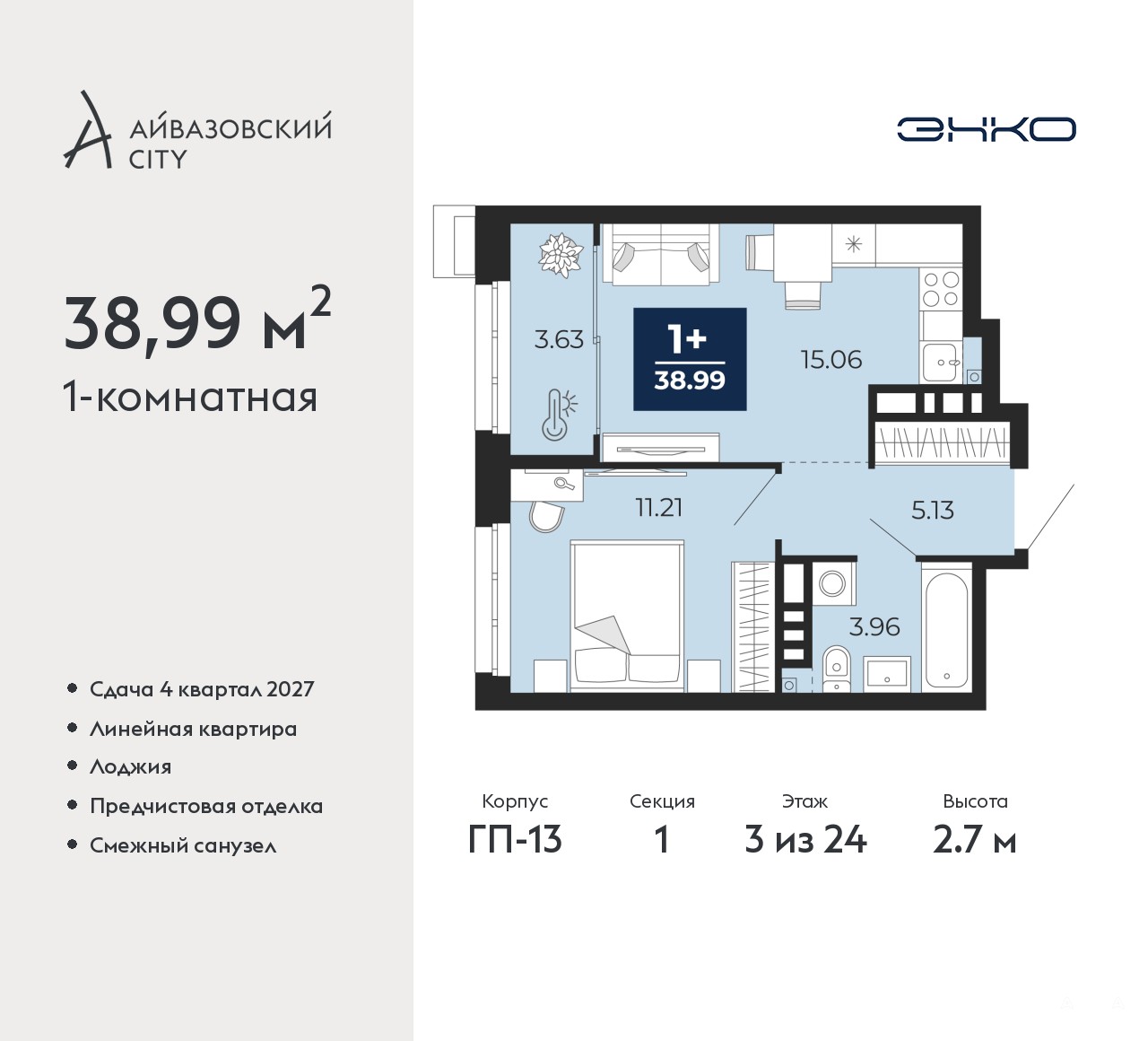 1-комн. квартира с предчистовой отделкой в ЖК "Айвазовский City" на 3 этаже. Общая площадь: 38.99 кв.м., жилая: 11.21 кв.м., площадь просторной кухни-столовой: 15.06 кв.м. Все окна выходят на одну сторону. В квартире одна лоджия, один совмещенный санузел. Высота потолков 2.7 м.