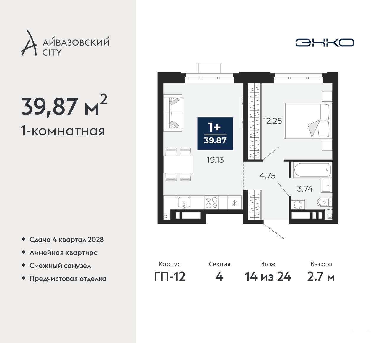 Продается 1-комн. квартира с предчистовой отделкой в ЖК "Айвазовский City" на 14 этаже. Общая площадь: 39.87 кв.м., жилая: 12.25 кв.м., площадь просторной кухни-столовой: 19.13 кв.м. Все окна выходят на одну сторону. В квартире один совмещенный санузел. Высота потолков 2.7 м.