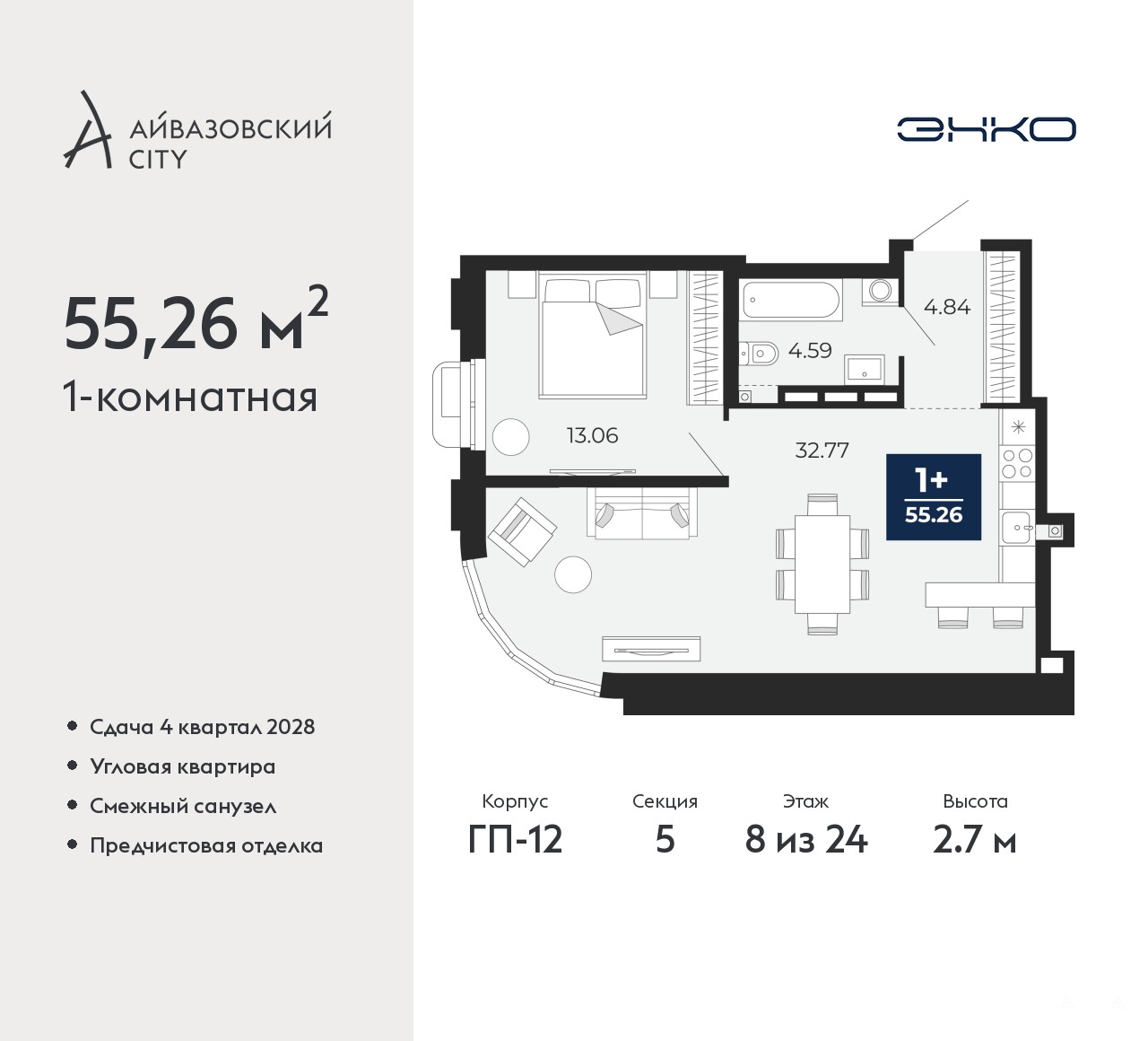 Продается однокомнатная квартира с предчистовой отделкой в ЖК "Айвазовский City" на 8 этаже. Общая площадь: 55.26 кв.м., жилая: 13.06 кв.м., площадь просторной кухни-столовой: 32.77 кв.м. Угловая квартира, идеально подойдет любителям тишины и панорамных видов. В квартире один совмещенный санузел. Высота потолков 2.7 м.