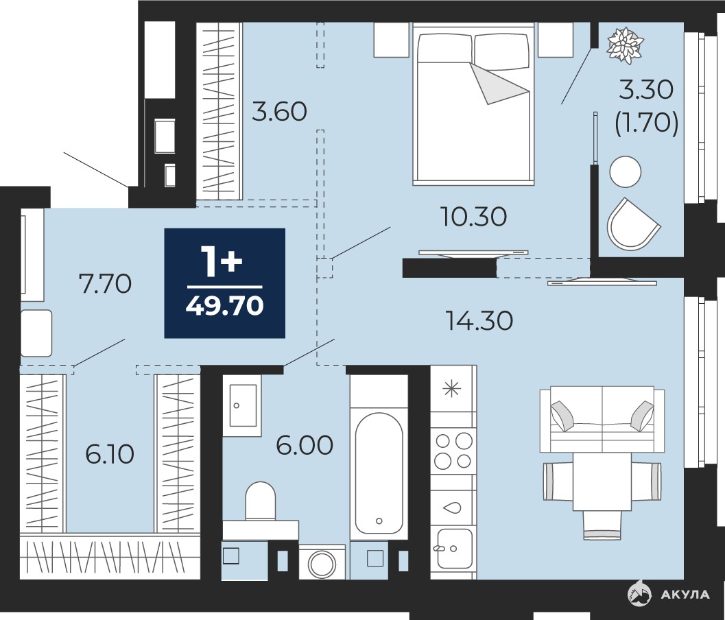 Продается 1-комн. квартира от застройщика с предчистовой отделкой в ЖК "Айвазовский City" на 2 этаже. Общая площадь: 49.7 кв.м., жилая: 10.3 кв.м., площадь просторной кухни-столовой: 14.3 кв.м. Все окна выходят на одну сторону. В квартире одна лоджия, один совмещенный санузел. Высота потолков 2.7 м.