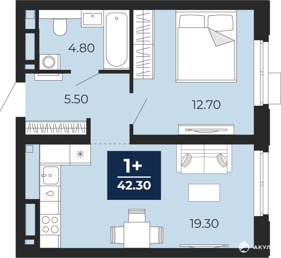 1-комн. квартира с предчистовой отделкой в ЖК "Айвазовский City" на 6 этаже. Общая площадь: 42.3 кв.м., жилая: 13.4 кв.м., площадь просторной кухни-столовой: 17.1 кв.м. Все окна выходят на одну сторону. В квартире одна лоджия, один совмещенный санузел. Высота потолков 2.7 м.