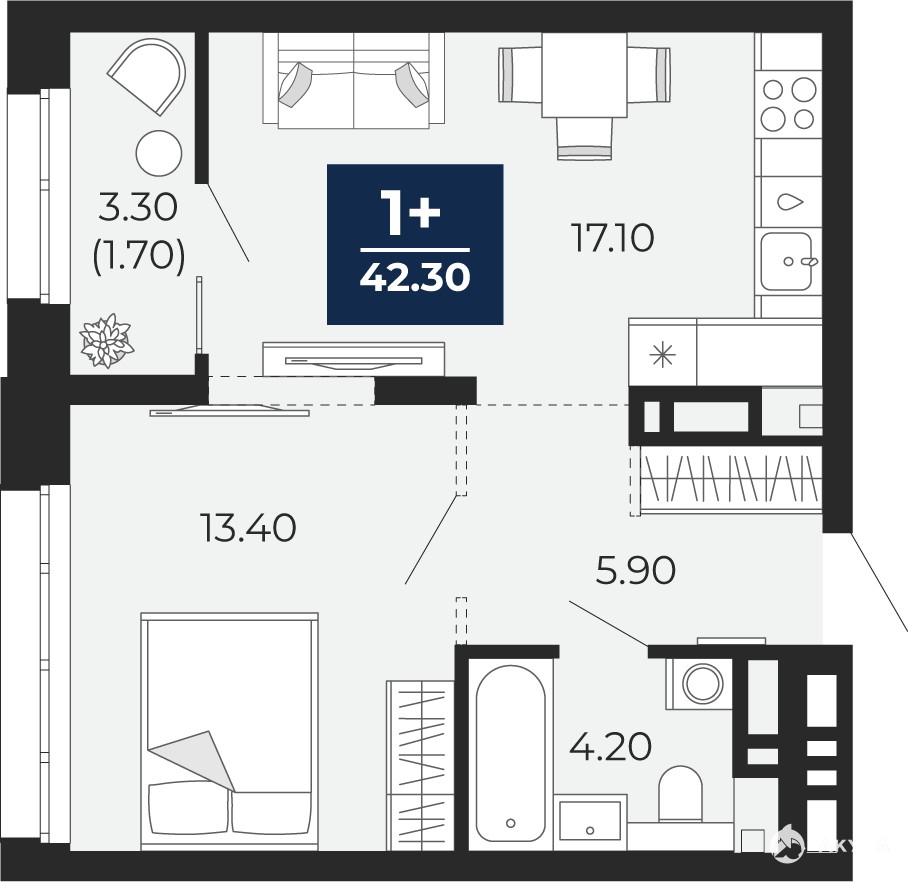 Просторная 1-комн. квартира с предчистовой отделкой в ЖК "Айвазовский City" на 7 этаже. Общая площадь: 42.3 кв.м., жилая: 13.4 кв.м., площадь просторной кухни-столовой: 17.1 кв.м. Все окна выходят на одну сторону. В квартире одна лоджия, один совмещенный санузел. Высота потолков 2.7 м.