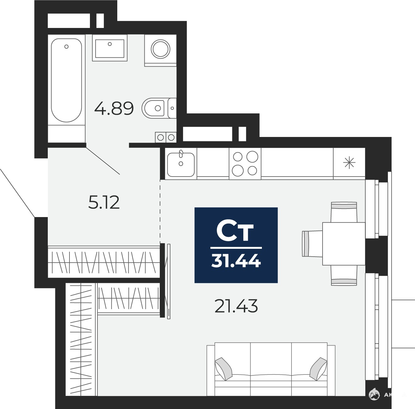 Однокомнатная квартира-студия от застройщика с предчистовой отделкой в ЖК "Айвазовский" на 18 этаже. Общая площадь: 31.44 кв.м., площадь гостиной 21.43 кв.м., из которых 5 кв.м. выделено под кухонную зону. Все окна выходят на одну сторону. В квартире один совмещенный санузел. Высота потолков 2.7 м.