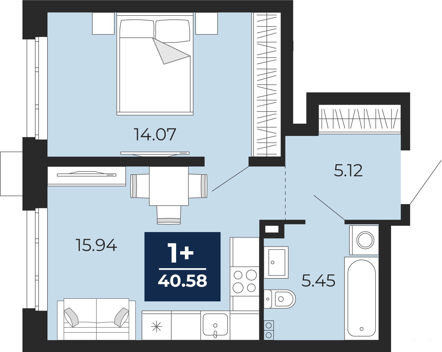 1-комн. квартира с предчистовой отделкой в ЖК "Айвазовский" на 2 этаже. Общая площадь: 40.58 кв.м., жилая: 14.07 кв.м., площадь просторной кухни-столовой: 15.94 кв.м. Все окна выходят на одну сторону. В квартире один совмещенный санузел. Высота потолков 2.7 м.