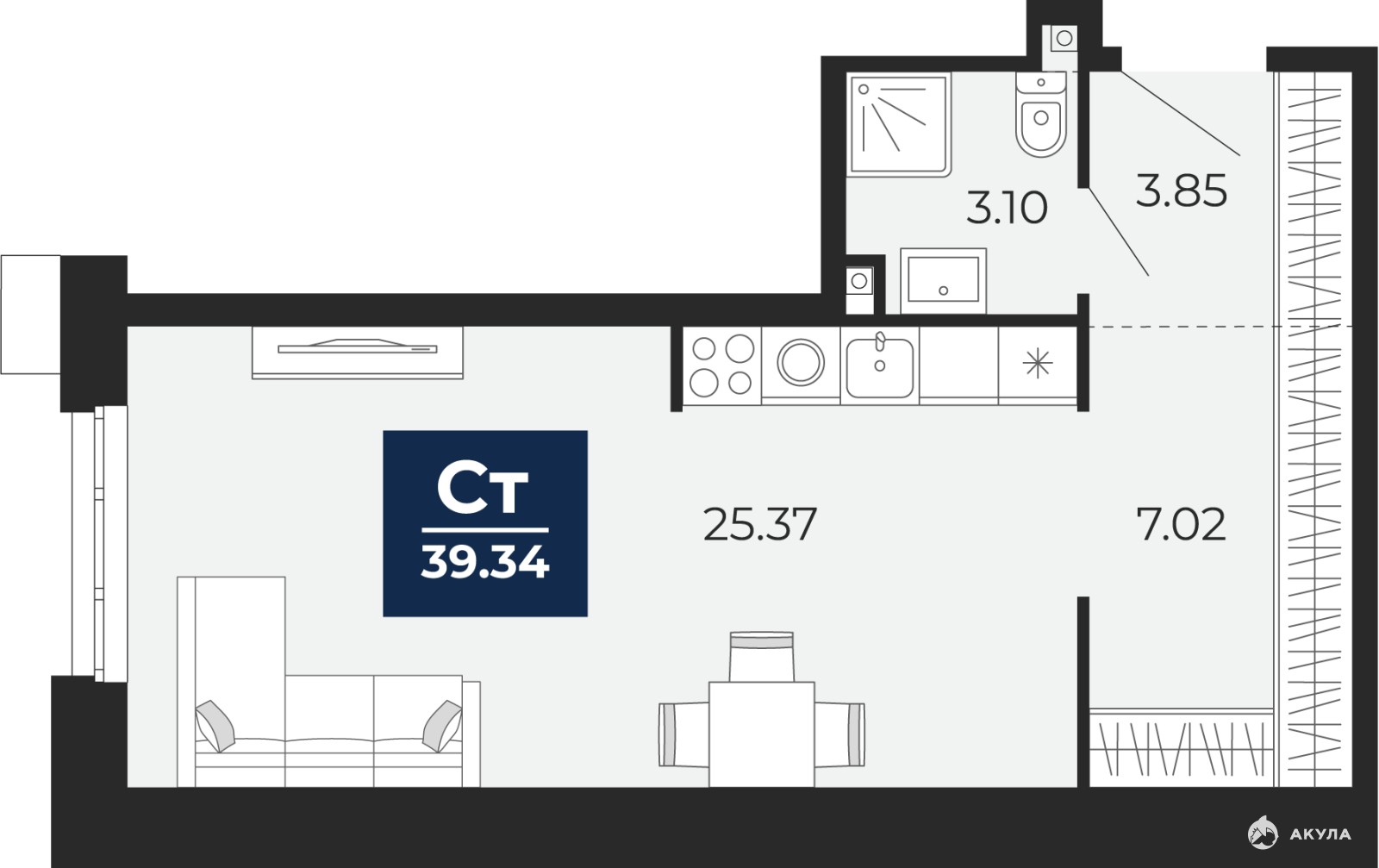 1-комн. квартира-студия с предчистовой отделкой в ЖК "Айвазовский" на 2 этаже. Общая площадь: 39.34 кв.м., площадь гостиной 26.37 кв.м., из которых 6 кв.м. выделено под кухонную зону. Все окна выходят на одну сторону. В квартире один совмещенный санузел. Высота потолков 2.7 м.