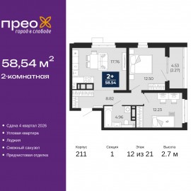 Продается 2-комн. квартира с предчистовой отделкой в ЖК "Прео" на 12 этаже. Общая площадь: 58.54 кв.м., жилая: 24.73 кв.м., площадь просторной кухни-столовой: 17.76 кв.м. Квартира угловая, очень светлая, естественная вентиляция при открытии окон. В квартире одна лоджия, один совмещенный...