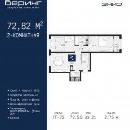Двухкомнатная квартира от застройщика с предчистовой отделкой в ЖК "Беринг" на 9 этаже. Общая площадь: 72.82 кв.м., жилая: 31.81 кв.м., площадь просторной кухни-столовой: 20.62 кв.м. Квартира - распашонка, без проходных комнат, окна выходят на paзные стороны дома. В квартире один балкон,...