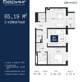 Просторная 2-комн. квартира в ЖК "Беринг" на 2 этаже. Общая площадь: 65.19 кв.м. Высота потолков 2.72 м. Дом монолитный, черырехподъездный, переменной этажности, от 19 до 24 этажей. Квартира находится в 3-й секции высотой 24 этажа в корпусе ГП-76. На этаже 6 квартир. В подъезде 1...