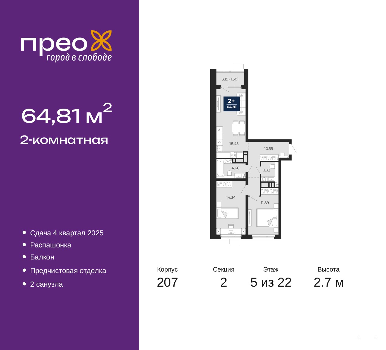 Просторная 2-комн. квартира с предчистовой отделкой в ЖК "Прео" на 5 этаже. Общая площадь: 64.81 кв.м., жилая: 26.23 кв.м., площадь просторной кухни-столовой: 18.45 кв.м. Квартира - распашонка, без проходных комнат, окна выходят на paзные стороны дома. В квартире один балкон, один совмещенный и один раздельный санузел. Высота потолков 2.7 м.