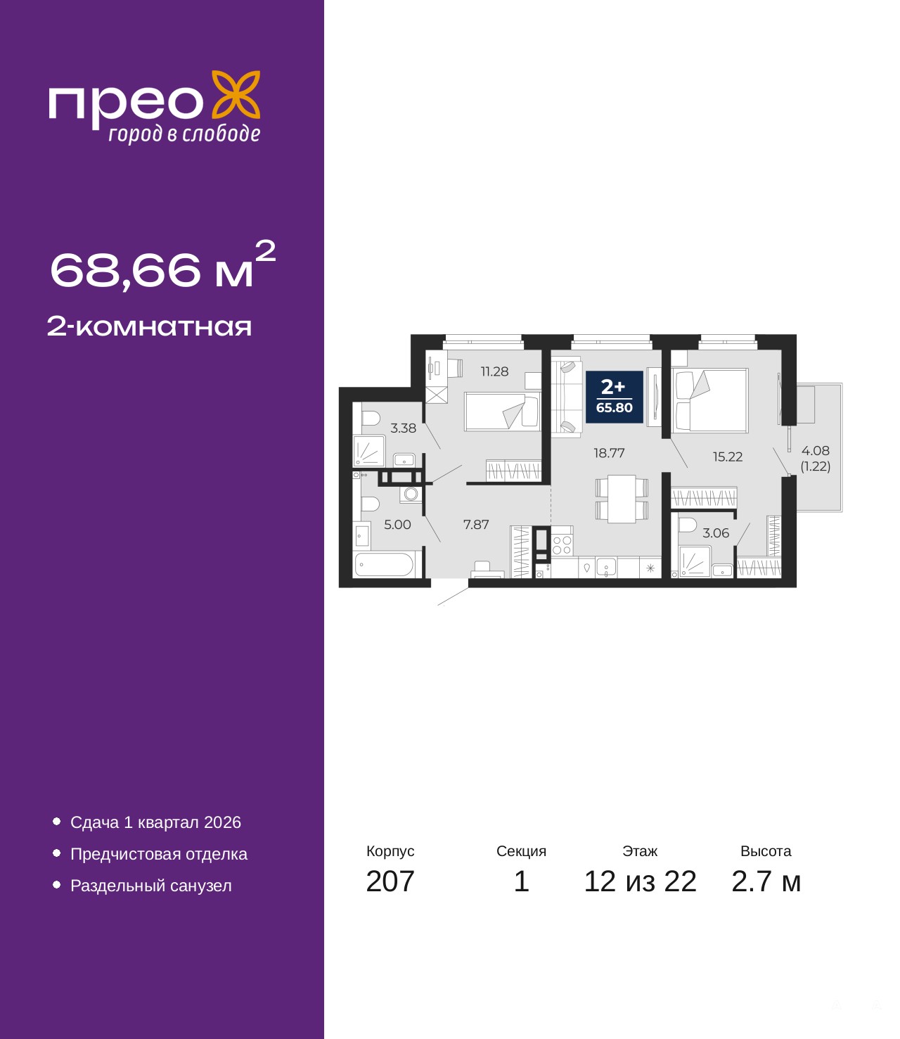 Двухкомнатная квартира с предчистовой отделкой в ЖК "Прео" на 12 этаже. Общая площадь: 68.66 кв.м. Высота потолков 2.7 м.