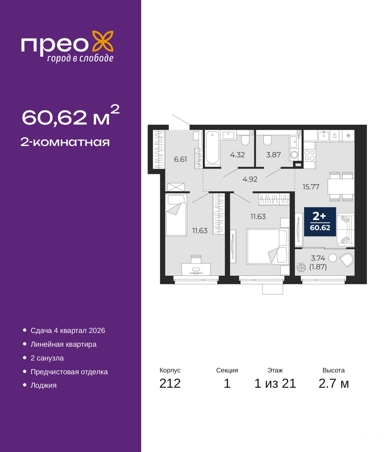 2-комн. квартира с предчистовой отделкой в ЖК "Прео" на 1 этаже. Общая площадь: 60.62 кв.м., жилая: 23.26 кв.м., площадь просторной кухни-столовой: 15.77 кв.м. Комнаты изолированные, все окна выходят на одну сторону. В квартире одна лоджия, один совмещенный и один раздельный санузел. Высота потолков 2.7 м.