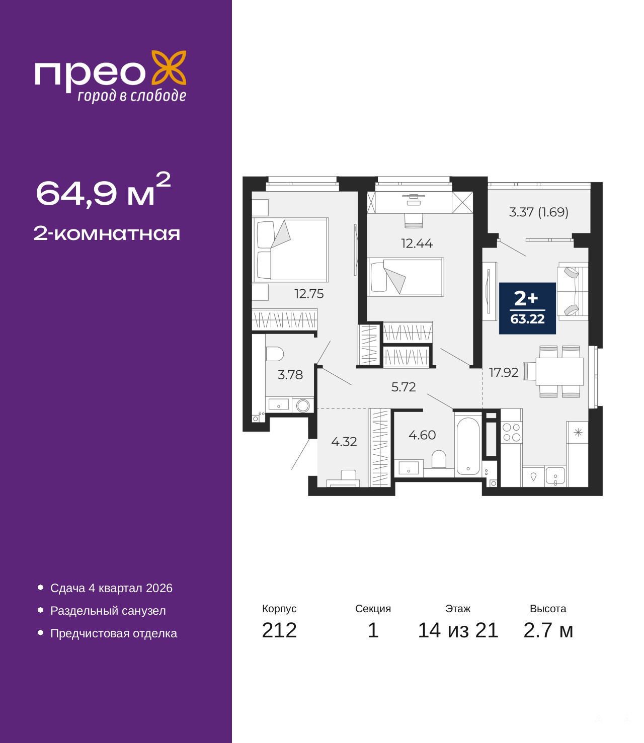 2-комн. квартира с предчистовой отделкой в ЖК "Прео" на 14 этаже. Общая площадь: 64.9 кв.м. Высота потолков 2.7 м.