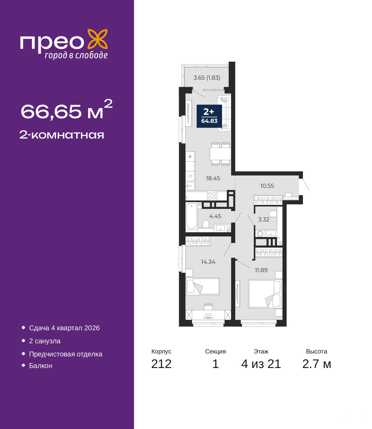 Просторная 2-комн. квартира с предчистовой отделкой в ЖК "Прео" на 4 этаже. Общая площадь: 66.65 кв.м., жилая: 26.23 кв.м., площадь просторной кухни-столовой: 18.45 кв.м. Квартира без проходных комнат, окна выходят нa три cтopoны дома. В квартире один балкон, один совмещенный и один раздельный санузел. Высота потолков 2.7 м.