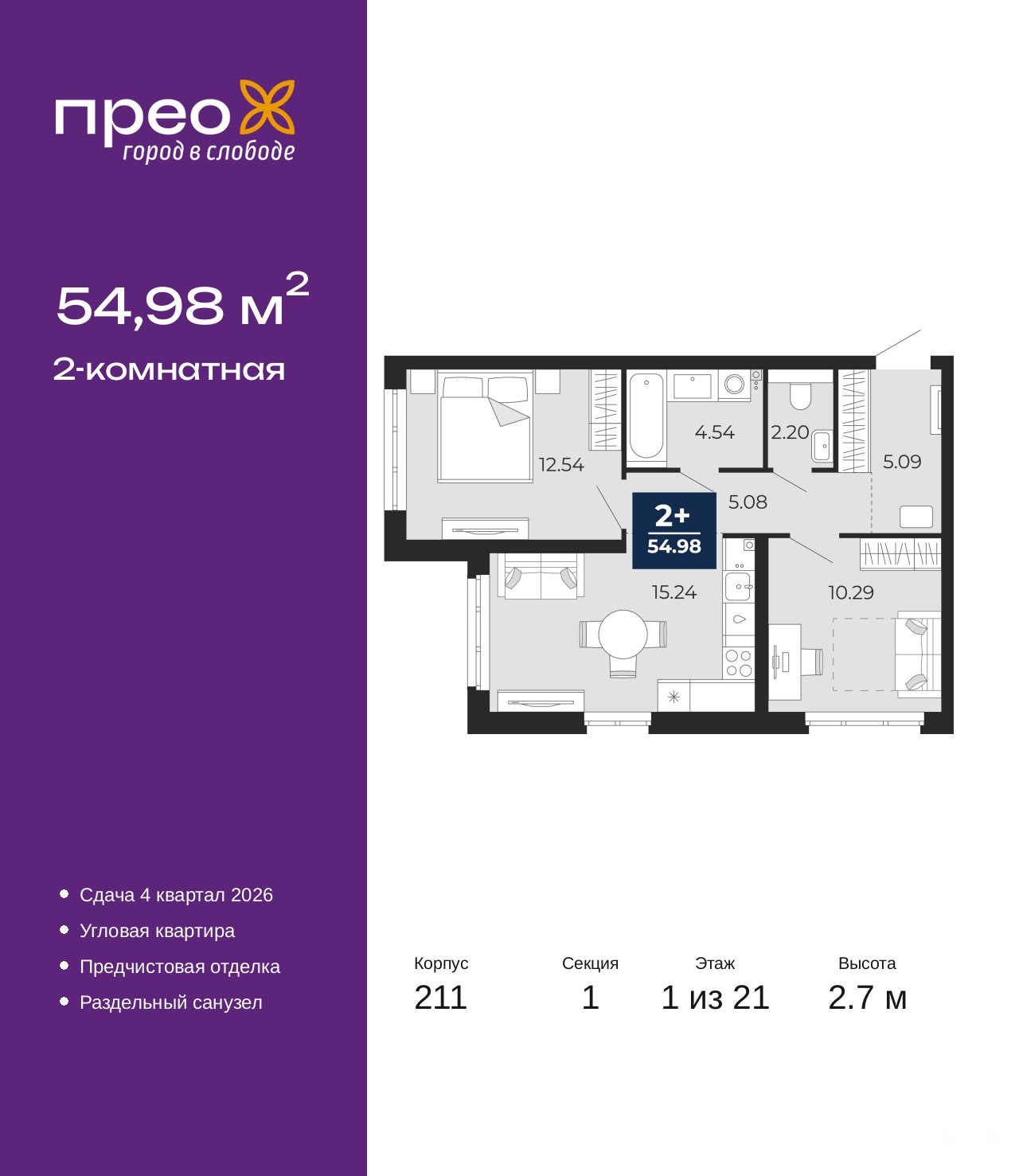 Продается 2-комн. квартира от застройщика с предчистовой отделкой в ЖК "Прео" на 1 этаже. Общая площадь: 54.98 кв.м., жилая: 22.83 кв.м., площадь просторной кухни-столовой: 15.24 кв.м. Квартира угловая, идеально подойдет любителям тишины и панорамных видов. В квартире один раздельный санузел. Высота потолков 2.7 м.