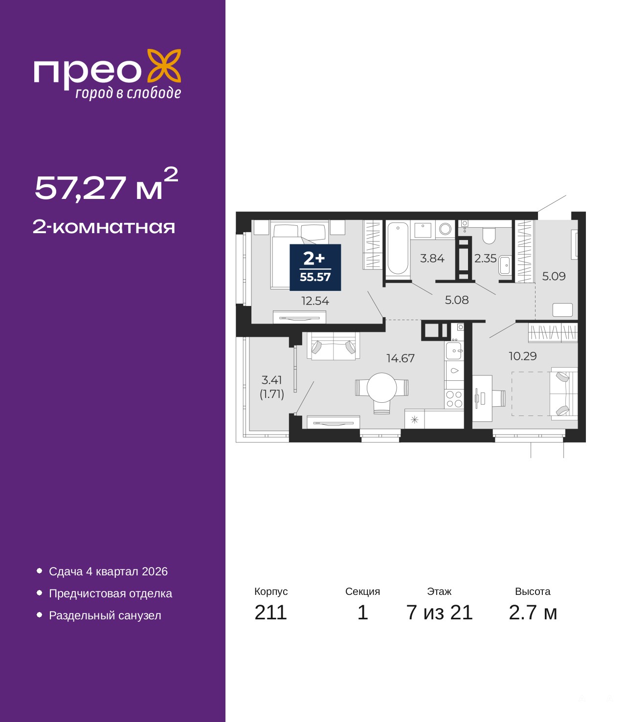 Продается 2-комн. квартира с предчистовой отделкой в ЖК "Прео" на 7 этаже. Общая площадь: 57.27 кв.м. Высота потолков 2.7 м.
