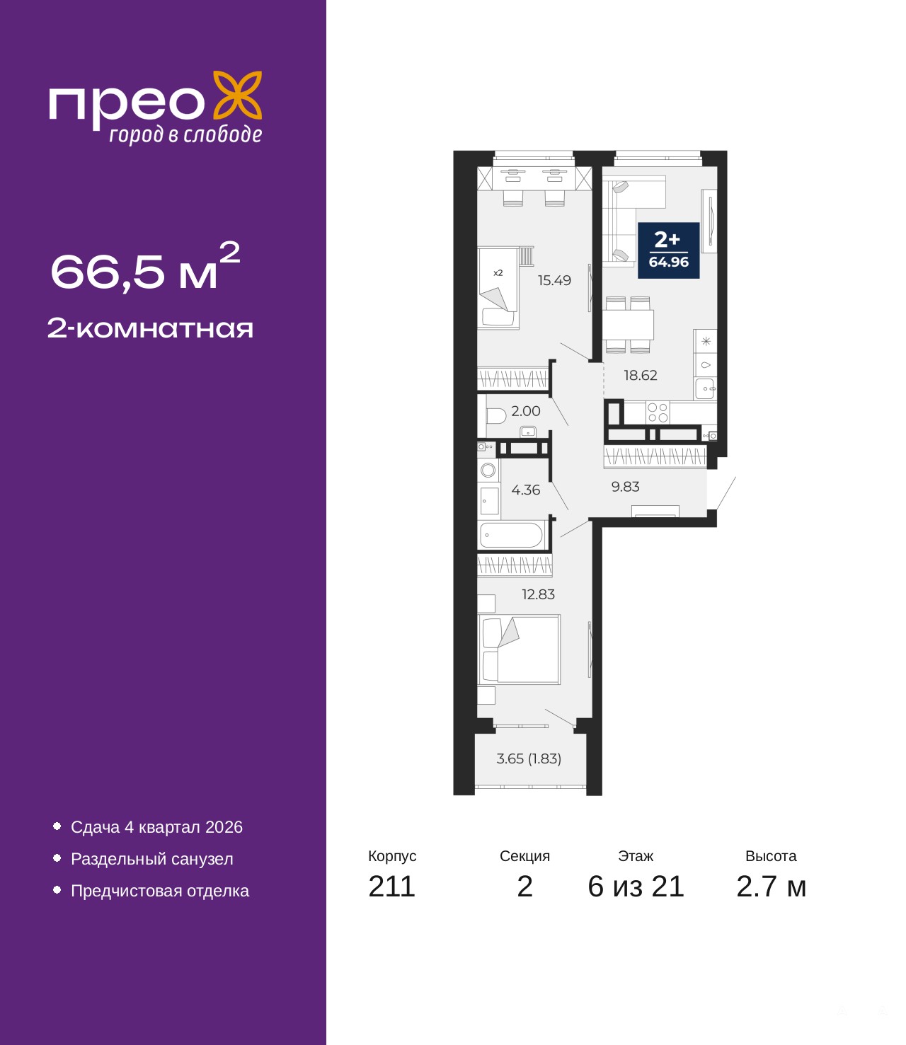 Двухкомнатная квартира от застройщика с предчистовой отделкой в ЖК "Прео" на 6 этаже. Общая площадь: 66.5 кв.м. Высота потолков 2.7 м.