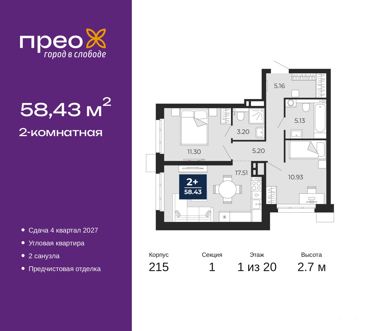2-комн. квартира с предчистовой отделкой в ЖК "Прео" на 1 этаже. Общая площадь: 58.43 кв.м., жилая: 22.23 кв.м., площадь просторной кухни-столовой: 17.51 кв.м. Угловая квартира, идеально подойдет любителям тишины и панорамных видов. В квартире два совмещенных санузла. Высота потолков 2.7 м.