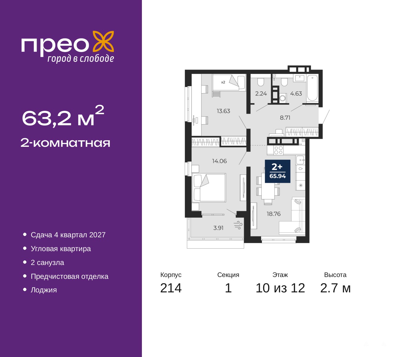 2-комн. квартира с предчистовой отделкой в ЖК "Прео" на 10 этаже. Общая площадь: 63.2 кв.м., жилая: 27.69 кв.м., площадь просторной кухни-столовой: 18.76 кв.м. Угловая квартира, идеально подойдет любителям тишины и панорамных видов. В квартире одна лоджия, один совмещенный и один раздельный санузел. Высота потолков 2.7 м.
