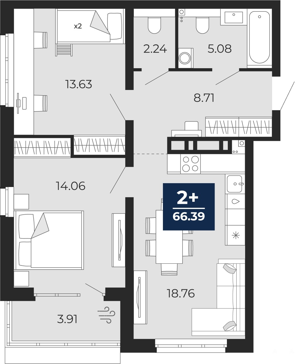 2-комн. квартира с предчистовой отделкой в ЖК "Прео" на 2 этаже. Общая площадь: 63.65 кв.м., жилая: 27.69 кв.м., площадь просторной кухни-столовой: 18.76 кв.м. Угловая квартира, очень светлая, естественная вентиляция при открытии окон. В квартире одна лоджия, один совмещенный и один раздельный санузел. Высота потолков 2.7 м.