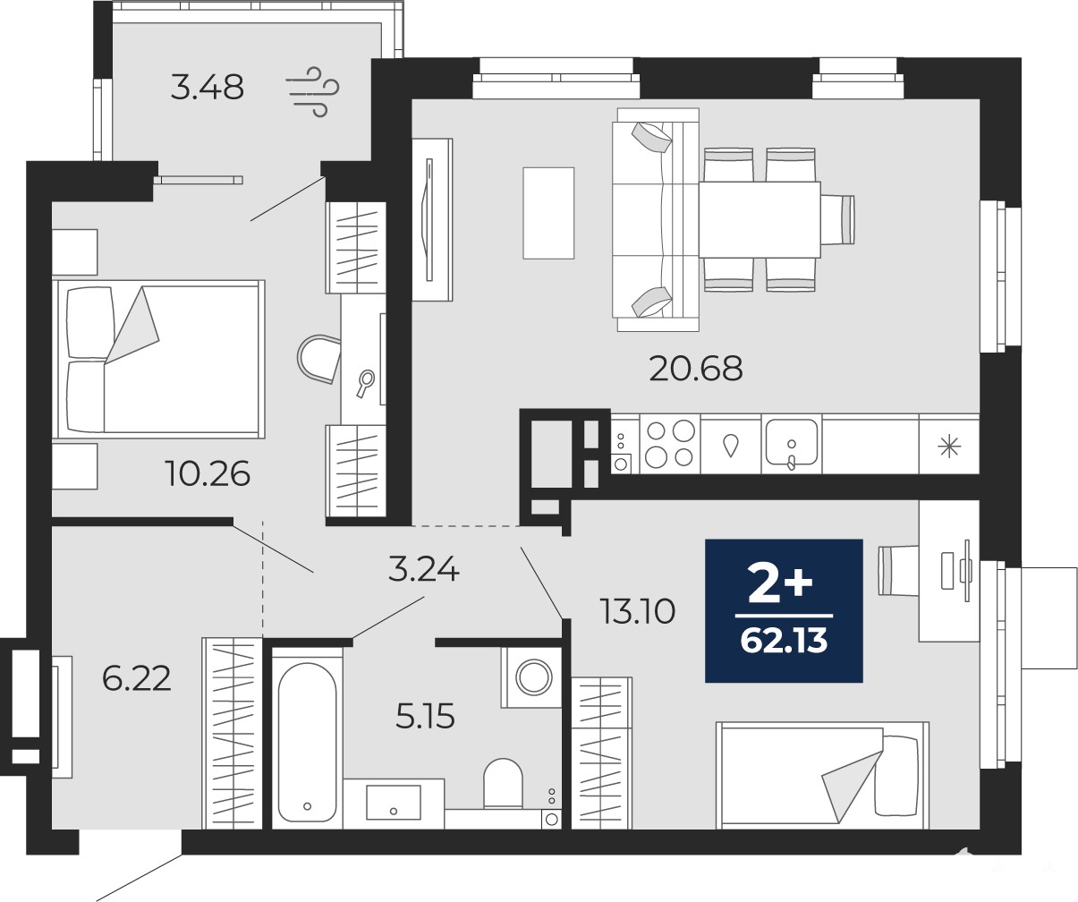 Двухкомнатная квартира с предчистовой отделкой в ЖК "Прео" на 2 этаже. Общая площадь: 59.69 кв.м., жилая: 23.36 кв.м., площадь просторной кухни-столовой: 20.68 кв.м. Квартира угловая, окна oбecпeчивaют paвнoмepнoe ocвeщeниe в тeчeниe дня. В квартире одна лоджия, один совмещенный санузел. Высота потолков 2.7 м.