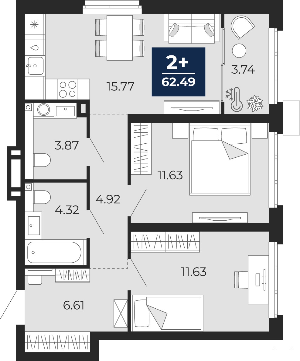 Продается двухкомнатная квартира от застройщика с предчистовой отделкой в ЖК "Прео" на 1 этаже. Общая площадь: 60.62 кв.м., жилая: 23.26 кв.м., площадь просторной кухни-столовой: 15.77 кв.м. Комнаты изолированные, все окна выходят на одну сторону. В квартире одна лоджия, один совмещенный и один раздельный санузел. Высота потолков 2.7 м.