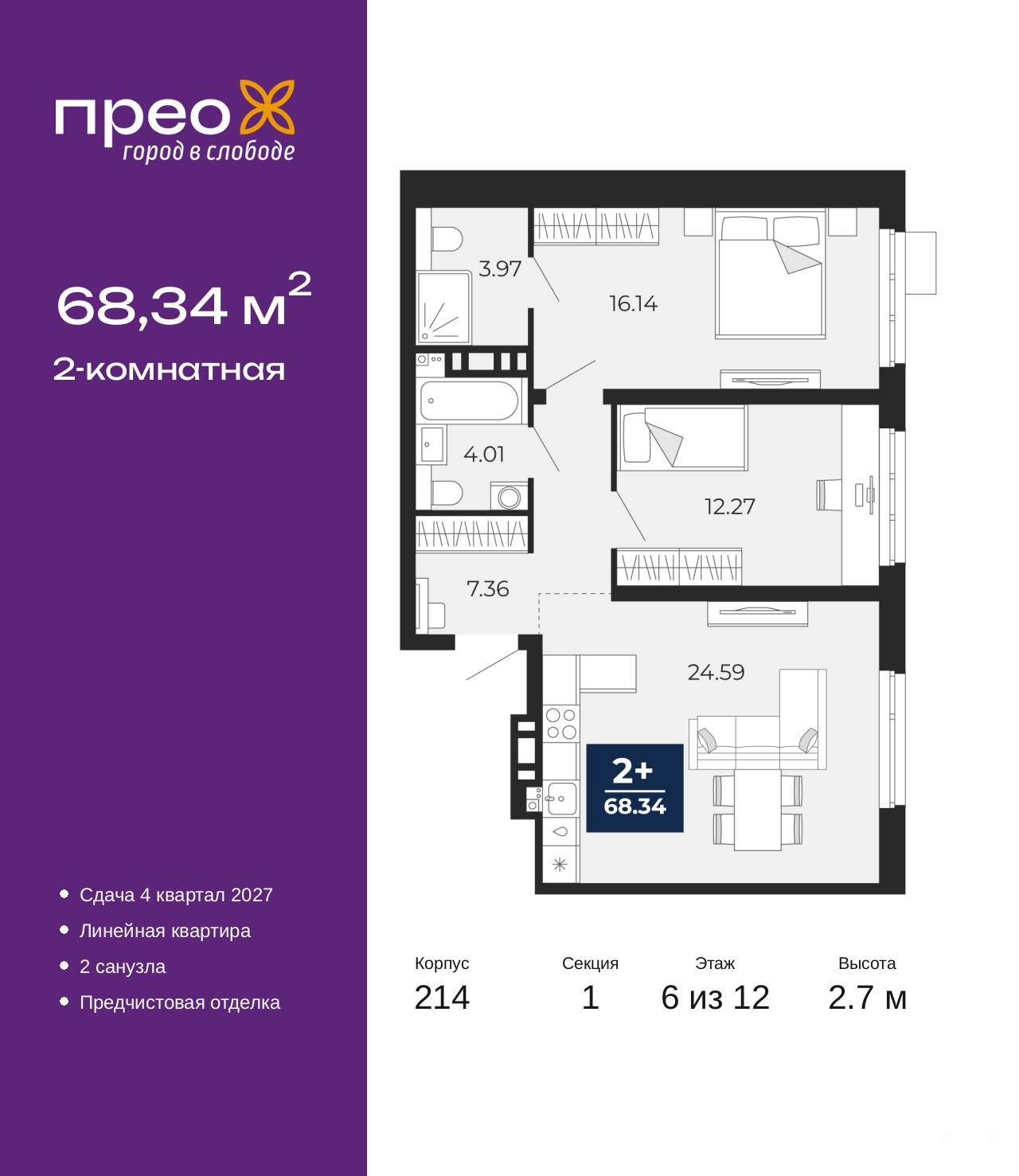 Просторная 2-комн. квартира с предчистовой отделкой в ЖК "Прео" на 6 этаже. Общая площадь: 68.34 кв.м., жилая: 28.41 кв.м., площадь просторной кухни-столовой: 24.59 кв.м. Комнаты изолированные, все окна выходят на одну сторону. В квартире два совмещенных санузла. Высота потолков 2.7 м.