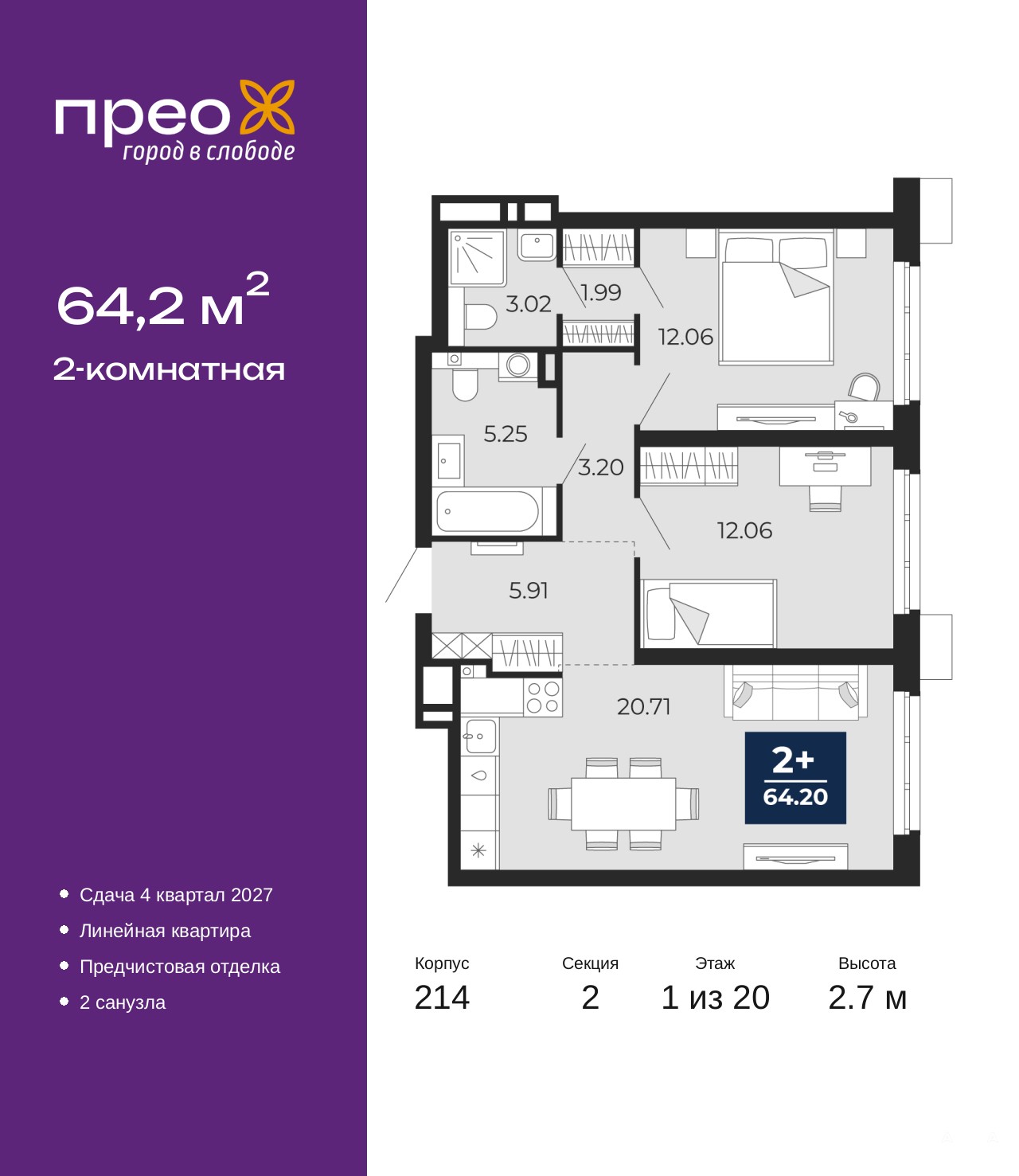 2-комн. квартира с предчистовой отделкой в ЖК "Прео" на 1 этаже. Общая площадь: 64.2 кв.м., жилая: 24.12 кв.м., площадь просторной кухни-столовой: 20.71 кв.м. Комнаты изолированные, все окна выходят на одну сторону. В квартире два совмещенных санузла. Высота потолков 2.7 м.
