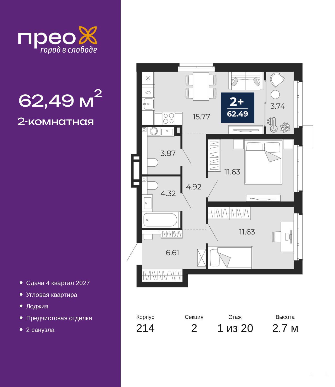 Двухкомнатная квартира от застройщика с предчистовой отделкой в ЖК "Прео" на 1 этаже. Общая площадь: 62.49 кв.м., жилая: 23.26 кв.м., площадь просторной кухни-столовой: 15.77 кв.м. Угловая квартира, очень светлая, естественная вентиляция при открытии окон. В квартире одна лоджия, один совмещенный и один раздельный санузел. Высота потолков 2.7 м.