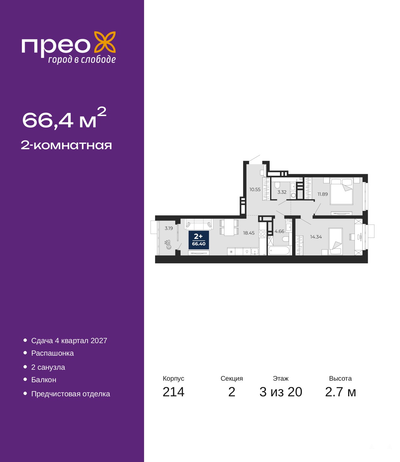 2-комн. квартира с предчистовой отделкой в ЖК "Прео" на 3 этаже. Общая площадь: 66.4 кв.м., жилая: 26.23 кв.м., площадь просторной кухни-столовой: 18.45 кв.м. Квартира - распашонка, без проходных комнат, окна выходят на paзные стороны дома. В квартире один балкон, один совмещенный и один раздельный санузел. Высота потолков 2.7 м.