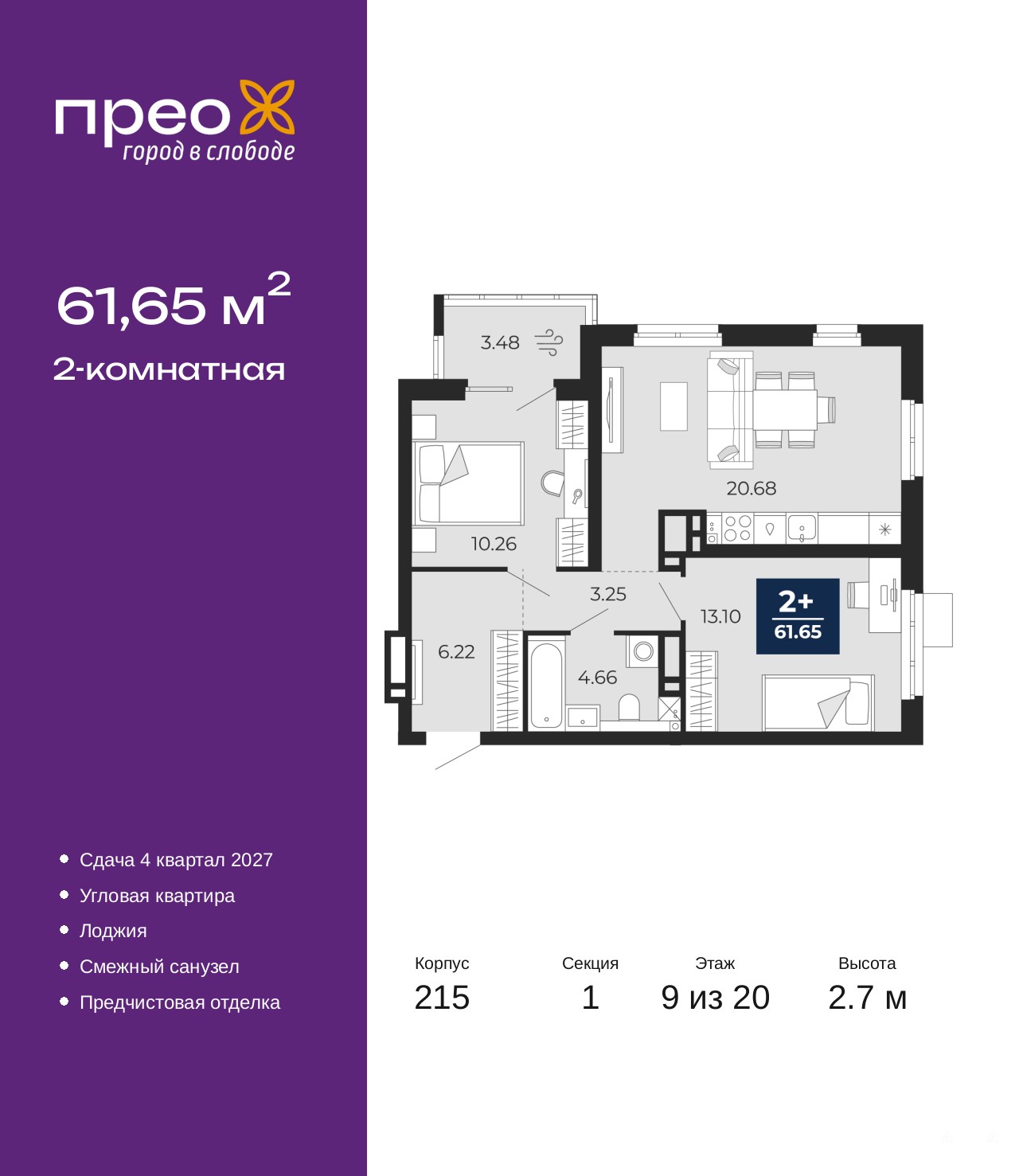 Продается 2-комн. квартира с предчистовой отделкой в ЖК "Прео" на 9 этаже. Общая площадь: 61.65 кв.м., жилая: 23.36 кв.м., площадь просторной кухни-столовой: 20.68 кв.м. Квартира угловая, очень светлая, естественная вентиляция при открытии окон. В квартире одна лоджия, один совмещенный санузел. Высота потолков 2.7 м.