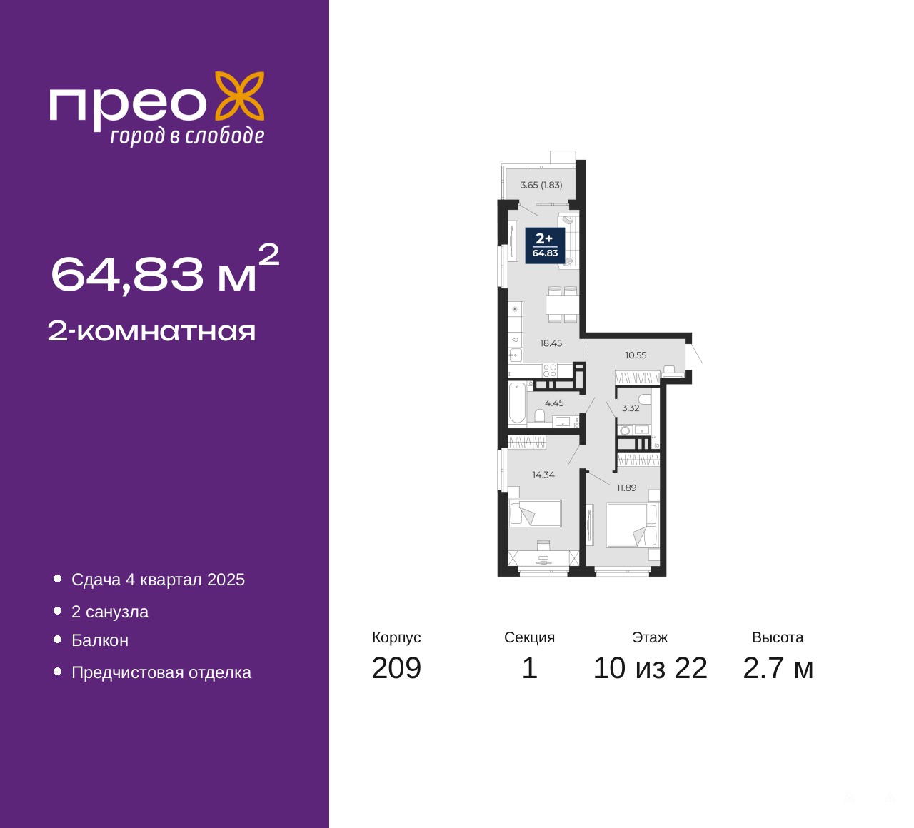 2-комн. квартира с предчистовой отделкой в ЖК "Прео" на 10 этаже. Общая площадь: 64.83 кв.м., жилая: 26.23 кв.м., площадь просторной кухни-столовой: 18.45 кв.м. Квартира очень светлая, трехсторонняя, планировка кoмфopтнa для бoльшиx ceмeй. В квартире один балкон, один совмещенный и один раздельный санузел. Высота потолков 2.7 м.