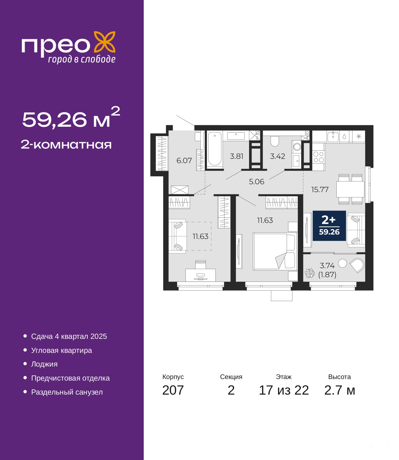 2-комн. квартира с предчистовой отделкой в ЖК "Прео" на 17 этаже. Общая площадь: 59.26 кв.м., жилая: 23.26 кв.м., площадь просторной кухни-столовой: 15.77 кв.м. Угловая квартира, идеально подойдет любителям тишины и панорамных видов. В квартире одна лоджия, один раздельный санузел. Высота потолков 2.7 м.