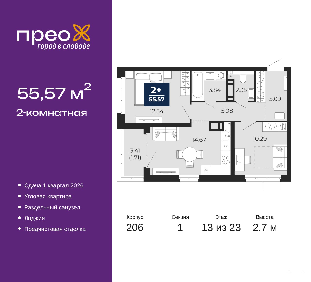 2-комн. квартира от застройщика с предчистовой отделкой в ЖК "Прео" на 13 этаже. Общая площадь: 55.57 кв.м., жилая: 22.83 кв.м., площадь просторной кухни-столовой: 14.67 кв.м. Квартира угловая, очень светлая, естественная вентиляция при открытии окон. В квартире одна лоджия, один раздельный санузел. Высота потолков 2.7 м.