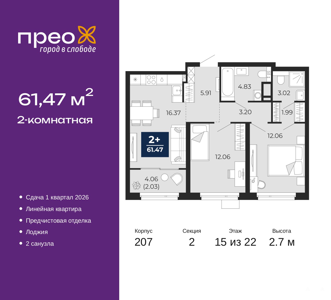 Продается двухкомнатная квартира с предчистовой отделкой в ЖК "Прео" на 15 этаже. Общая площадь: 61.47 кв.м., жилая: 24.12 кв.м., площадь просторной кухни-столовой: 16.37 кв.м. Комнаты изолированные, все окна выходят на одну сторону. В квартире одна лоджия, два совмещенных санузла. Высота потолков 2.7 м.