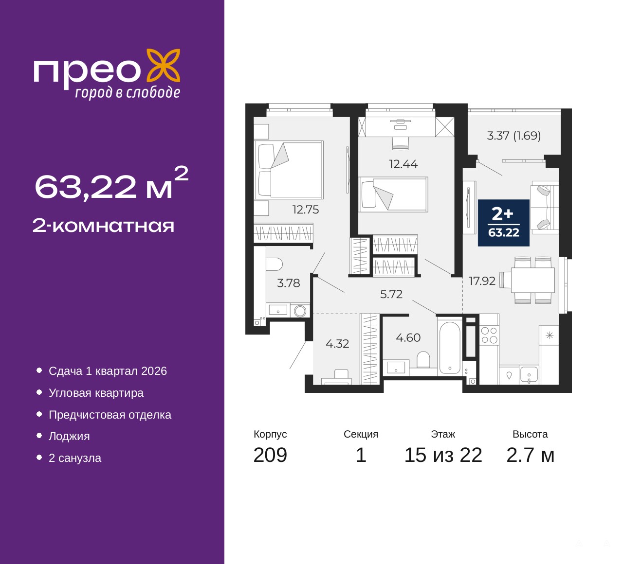 Продается двухкомнатная квартира с предчистовой отделкой в ЖК "Прео" на 15 этаже. Общая площадь: 63.22 кв.м., жилая: 25.19 кв.м., площадь просторной кухни-столовой: 17.92 кв.м. Угловая квартира, окна oбecпeчивaют paвнoмepнoe ocвeщeниe в тeчeниe дня. В квартире одна лоджия, один совмещенный и один раздельный санузел. Высота потолков 2.7 м.