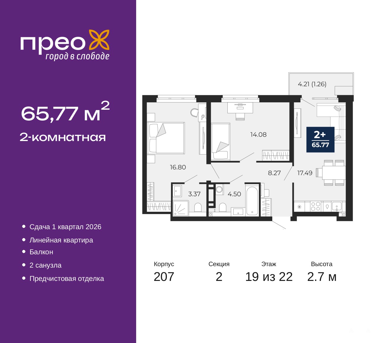 2-комн. квартира от застройщика с предчистовой отделкой в ЖК "Прео" на 19 этаже. Общая площадь: 65.77 кв.м., жилая: 30.88 кв.м., площадь просторной кухни-столовой: 17.49 кв.м. Комнаты изолированные, все окна выходят на одну сторону. В квартире один балкон, два совмещенных санузла. Высота потолков 2.7 м.